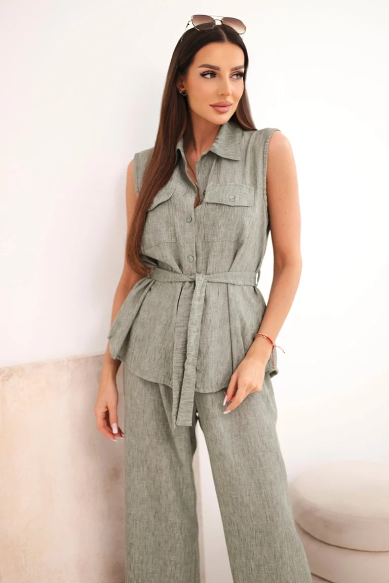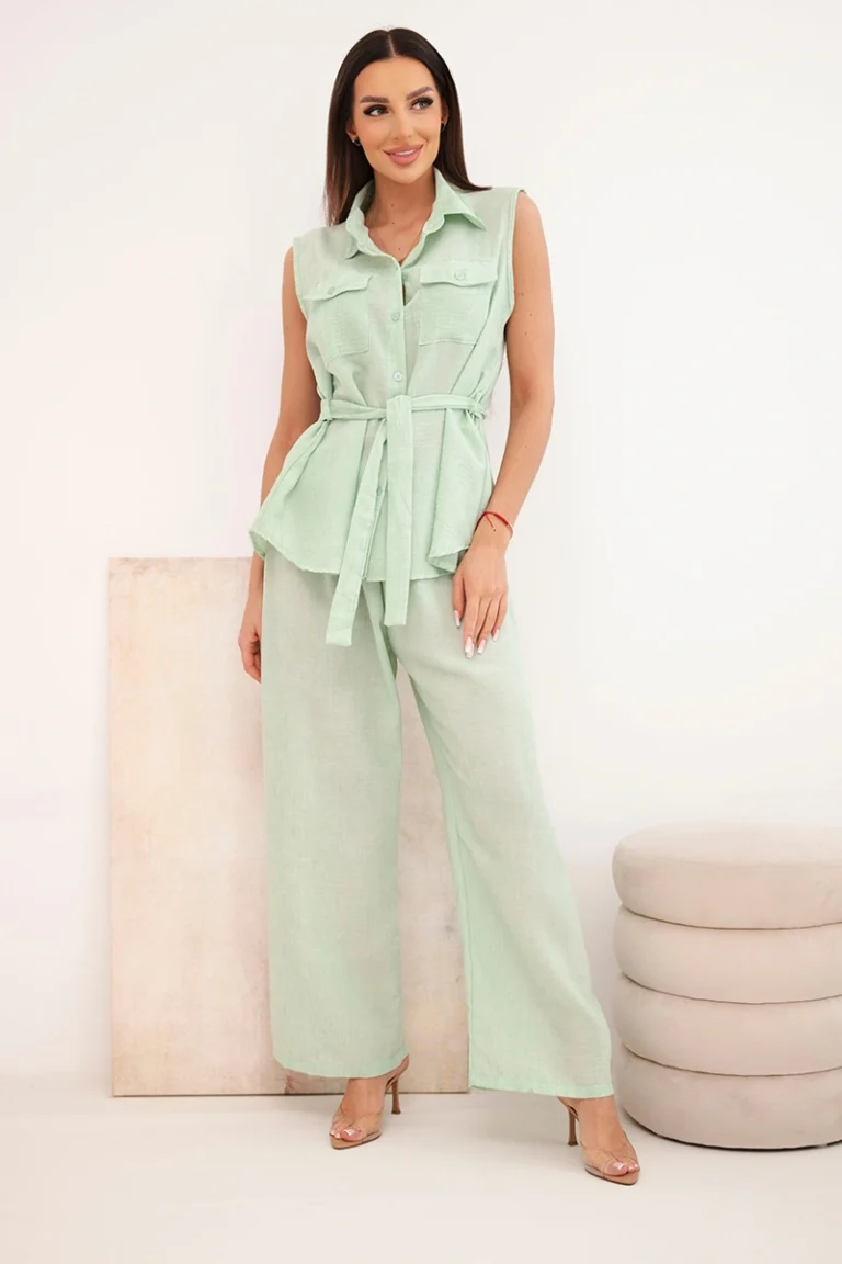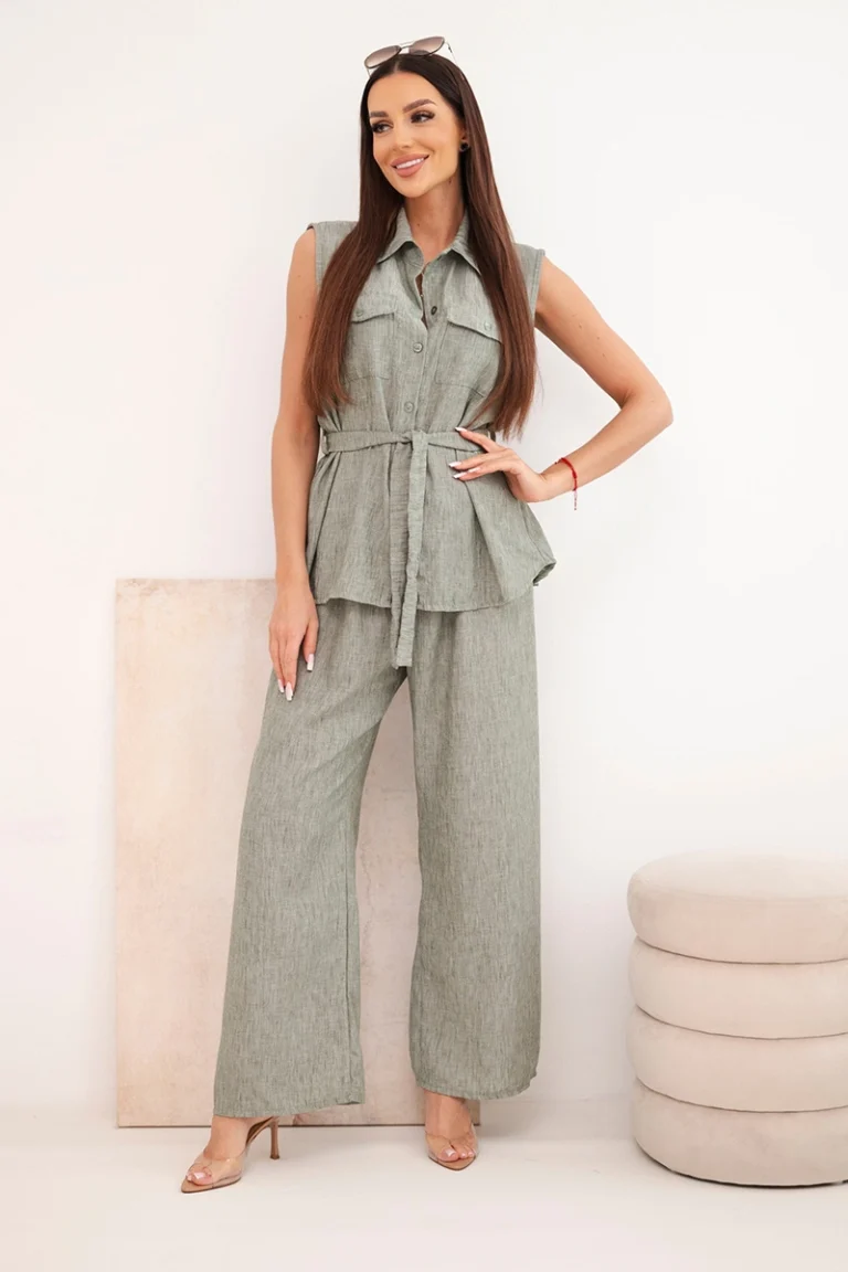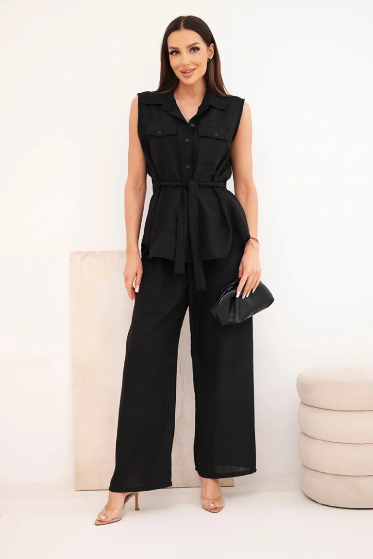 Elegantný komplet z elastického materiálu vo veľmi pohodlnom strihu. So širokými nohavicami a blúzky na gombíky s opaskom.