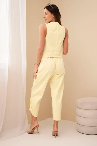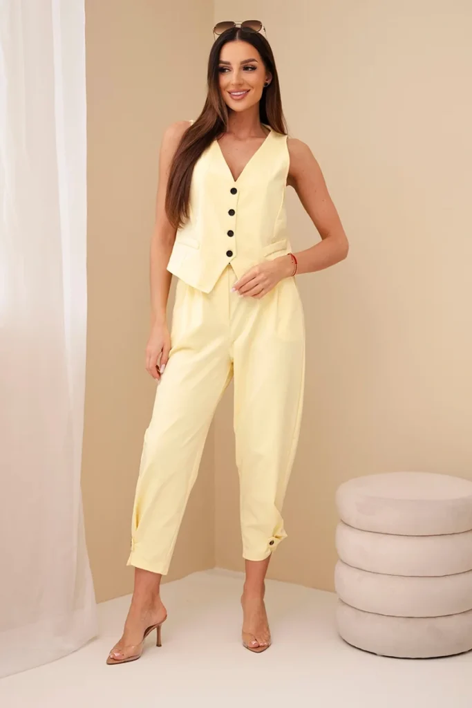 Elegantný komplet z elastického, bavlneného materiálu vo veľmi pohodlnom strihu. Nohavice so zúžením a patentom dole a štýlovou vestou.