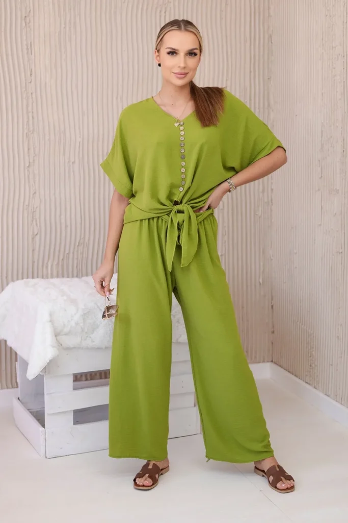Ležérny nohavicový komplet z ľahkého, elegantného materiálu s ozdobnými gombíkmi, vo veľmi pohodlnom strihu. S viazaním v páse na tope aj na nohaviciach.